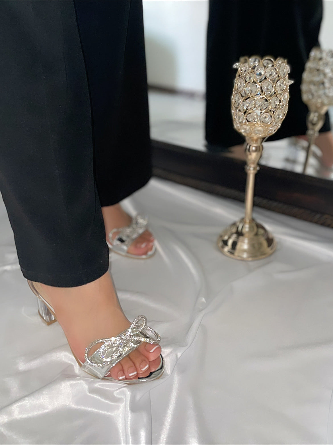 sandalia tacón cuadrado transparente con adorno de moño de cristal